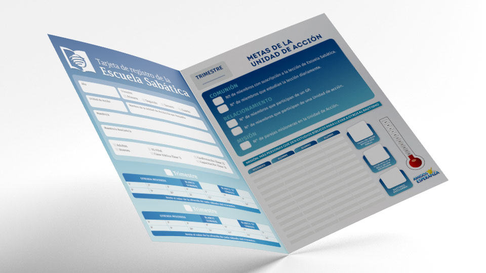 La tarjeta de registro de la unidad de acción, nos ayuda a trabajar los 4 objetivos de la Escuela Sabática. En la hora de la clase, en los 15 minutos misioneros, debemos pasar el registro de cada miembro, revisar como están avanzando los estudios bíblicos, y además orar por 5 personas para que cada miembro trabaje en su salvación. La tarjeta de registro le ayudará a trabajar estos objetivos. Puede imprimir o solicitar en su Misión/Asociación al departamento de Escuela Sabática.